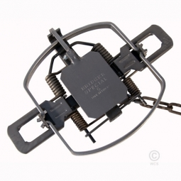 New and Improved! The new Bridger #5 coilspring has heavier swivels, a much thicker heavy duty dog with a night latch, a "spring keeper" to keep the 4-coil springs where they should be, a steel spacer between the pan posts to allow you to tighten the pan tension to your desired level, and a plated bolt with nylon lock nut to keep your pan tension where you want it catch after catch. 7 ¼" jaw spread. Four coiled for otter, beaver, wolf, and lion. A Best Seller!