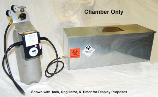 The WCS Wildlife Euthanasia Chamber is constructed of 22 gauge galvanized sheet metal. This is a top loading model which allows you to place both the animal & trap into the chamber eliminating unnecessary contact.