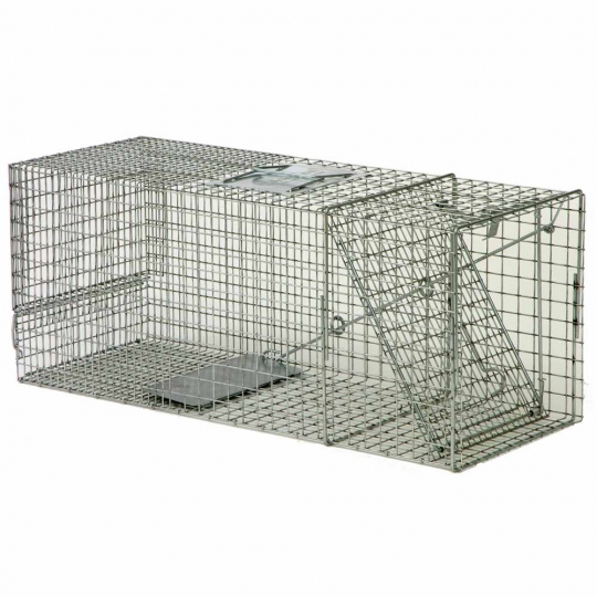 Safeguard Cage Trap with Front Release. This trap measures 30"L x 11"W x 12"H and is constructed of 1" x 1" 14 ga. wire mesh. Good for capturing skunk, raccoon, woodchuck (groundhog), armadillo, feral cats, etc.