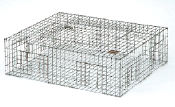 Safeguard Pigeon Trap (3 compartment) measures 84"L x 24"W x 8"H when extended for use. Constructed of 1" x 2" - 14 gauge galvanized wire mesh this trap has three compartments and will hold 30 to 40 pigeons per compartment. For transportation and storage, the trap folds "suitcase style" to 25"L x 25"W x 29"H with a top carrying handle. Designed for commercial use and larger sized jobs, the trap has a total of 12 outer doors, 4 inner doors and a top entry door for access to captured birds and baiting.