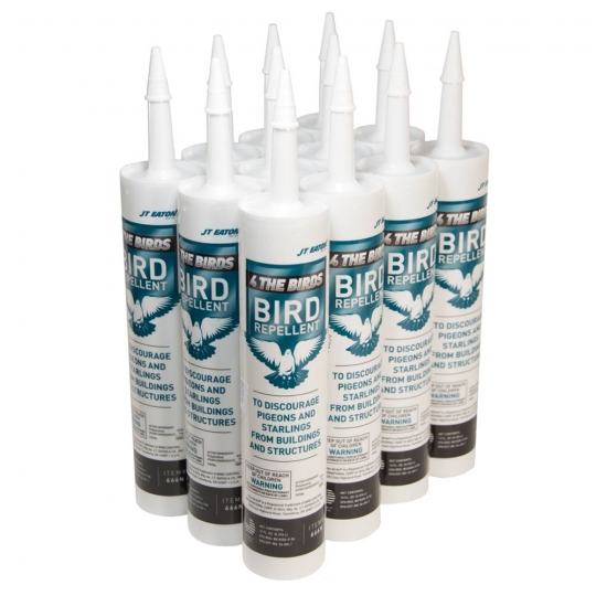 4 the Birds ®Bird-Proof Transparent Repellent Gel by J.T. Eaton in 10 oz. tubes.  Treat window sills, roof lines, gutter edges, signs, ornamental copings, cornices & ledges. For repelling pigeons, starlings, and house sparrows from buildings and adjacent structures. 4 the Birds Transparent Gel is easily applied with a caulking gun or putty knife and is weather resistant for lasting outdoor application. All surfaces should be cleared of dust, dirt, droppings, and loose debris before treatment application. A second treatment may be necessary if flattened by heavy bird traffic. 4 The Birds Gel will not harm birds when used as directed.