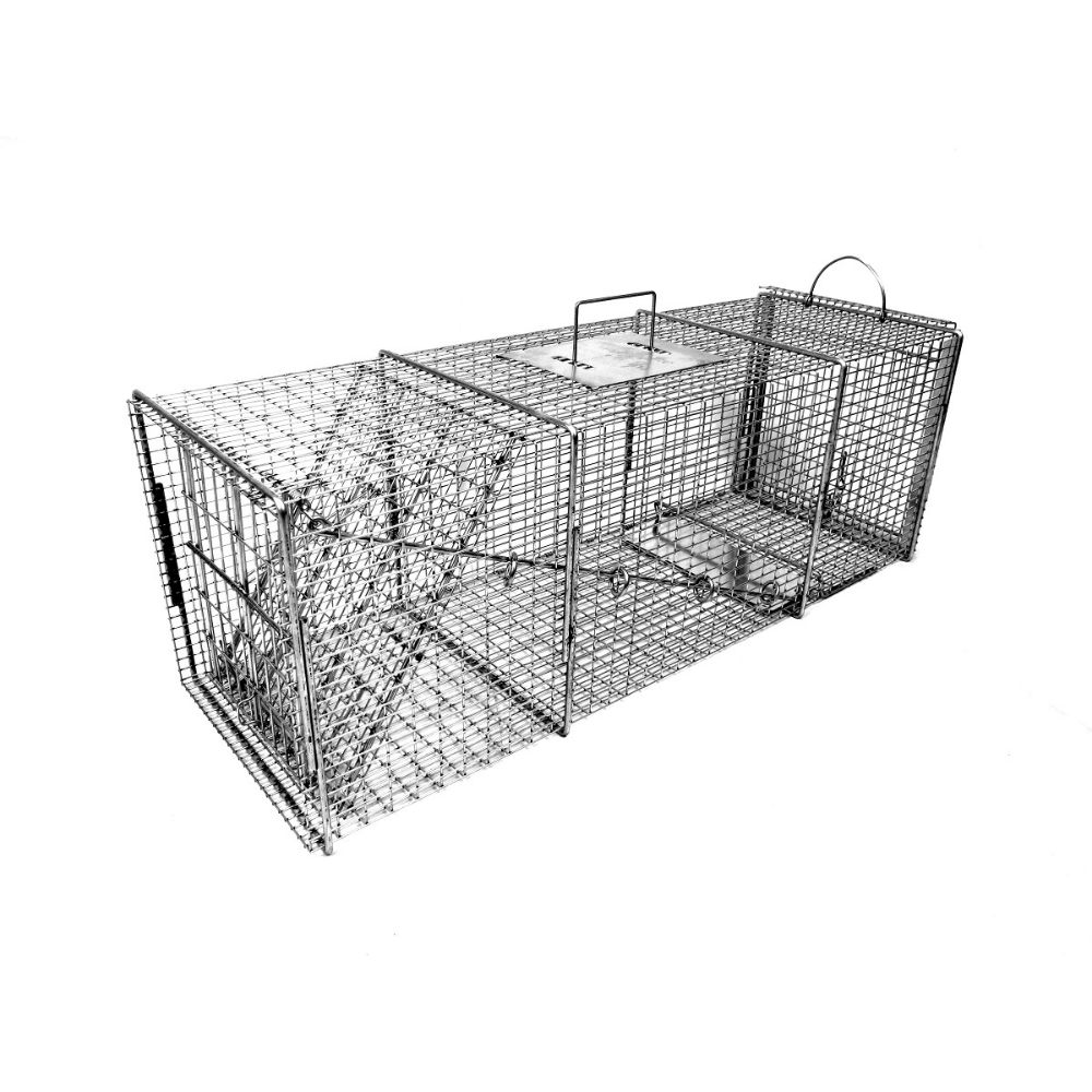 Tomahawk Model 609SS is a professional live trap for large raccoon, groundhog / woodchuck, and similar size animals. This trap measures 36L x 12W x 12H. This trap features a very strong wire frame with tight mesh pattern and extra reinforcing steel rods welded to the frame for even greater strength. Tighter mesh patterns not only give the trap additional strength, but also prevent critters from reaching into the trap and stealing bait, and reaching out of the trap and damaging lawns, roofs, decks, and other property. They also feature a pan guard system consisting of heavy gauge sheet metal pans and 1/4" pan guard rods making it nearly impossible for critters to damage the trip pan system.