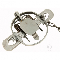 Duke #1 3/4 Standard Jaw, Double Coil: Levers rise high on the jaws to ensure positive locking. Adjustable pan tension with a #10 brass nut & bolt assembly. Universal swivel at the end of the 6" 2-0 double loop chain. Great for capturing Bobcat, Coyote, Fox, Raccoon.
