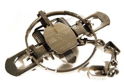 Oneida Victor #1.75 with the Forged On Jaw feature. This trap has a jaw spread of 5 3/8" with wide faced off-set jaws. It is center chained with two swivels. This trap can be used to capture fox, coyote, badger, bobcat, raccoon, lynx, nutria, otter, etc.